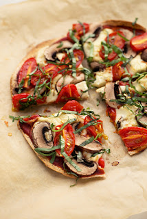 Personal Tortilla Pizza with Homemade Mozzarella, Mushrooms, Tomatoes & Basil (Vegan)